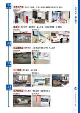 108 06.07 五官科門診 全新牙科專區,引進全新進口儀器提供舒適安全環境。 108.06.07 109.02.25 服務台 潔淨明亮,增設高齡「愛心友善」快速通關櫃檯,友善櫃台。 108.06.07 109.03.20 108 07.05 108 10.29 志工服務台 整齊清潔,友善櫃台方便身心障礙人士洽詢。 108.07.05 109.03.20 十一病房 潔淨清爽、採光通透。 108.10.29 109.12.31 108 11.05 公共關係室 美化環境,獨立空間,注重會談隱私。 108.11.05 109.03.20 31 承先啟後 繼往開來 中心綜合醫院五十週年慶特刊