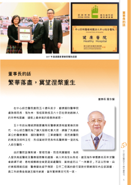 107 年通過國建署健康醫院認證 5 董事長的話 繁華落盡,冀望涅槃重生 董事長 雷永耀 在中心綜合醫院創院五十週年前夕,緬懷國防醫學院 盧致德院長,張先林、張祖棻教授及六十四位原始創辦人 的辛勞和貢獻,謹致上最崇高的敬意與感恩。 五十年前台灣經濟剛要騰飛而醫療資源相當貧瘠的時 代,中心綜合醫院為了擴大服務社會大眾,網羅了先總統 蔣公的醫療團隊,國防醫學院、三軍總醫院、榮民總醫院 的教授及部科主任,形成當時罕見各科名醫齊聚一堂的私 人綜合醫院。 由於醫院設備新穎、管理完善、院舍亮麗耀眼,為病 人提供高超醫術及醫療服務聲名遠播,病人來自全台各地、遠至海外華僑慕名而來求醫 者絡繹不絕,患有疑難雜症者更是首選醫院,當時盛況以「一床難求」不足以形容。由 於業務開展迅速,醫療營收超乎預期,五仟二佰萬的銀行貸款於開業兩年內全部清還, 員工年終獎金高達五個月薪資,當年繁榮景況可見一斑。 董事長的話 中心綜合醫院五十週年慶特刊